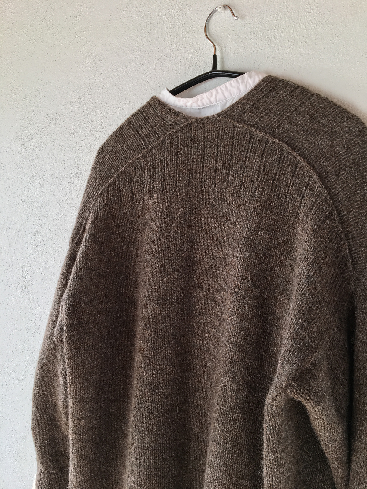 Der Cardigan wird ganz einfach in Hin- und Rückreihen glatt rechts gearbeitet, und zwar von oben nach unten. Die dekorativen Ränder und Einfassungen bestehen aus einem breiten Rippenmuster, das  zusammen mit einer falschen Naht das obere Rückenteil kennzeichnet. Die Jacke hat Taschen, dessen Tiefe und Platzierung von der Länge der Jacke abhängt. Die Ärmel werden direkt angestrickt, so gibt es bei diesem Design aus einem Stück praktisch keine Endbearbeitung.