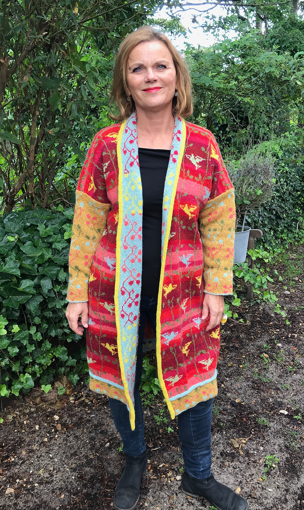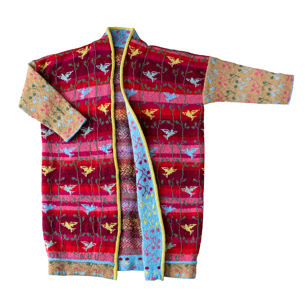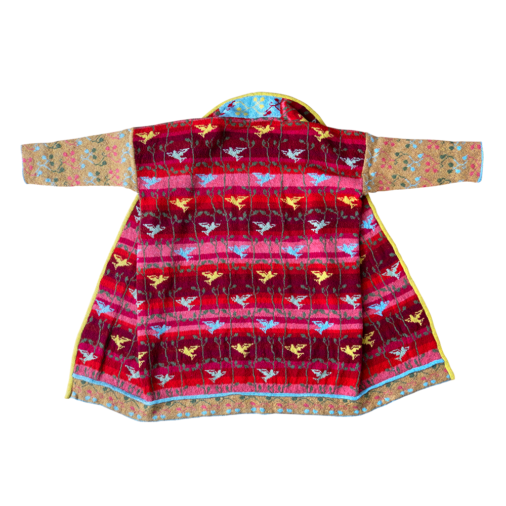 Wunderschöner neuer Mantel von Christel Seyfarth. In Sand- und Meeresfarben gehaltene Vogel- und Rankenmuster zieren die kräftige rote Hintergrundfarbe.